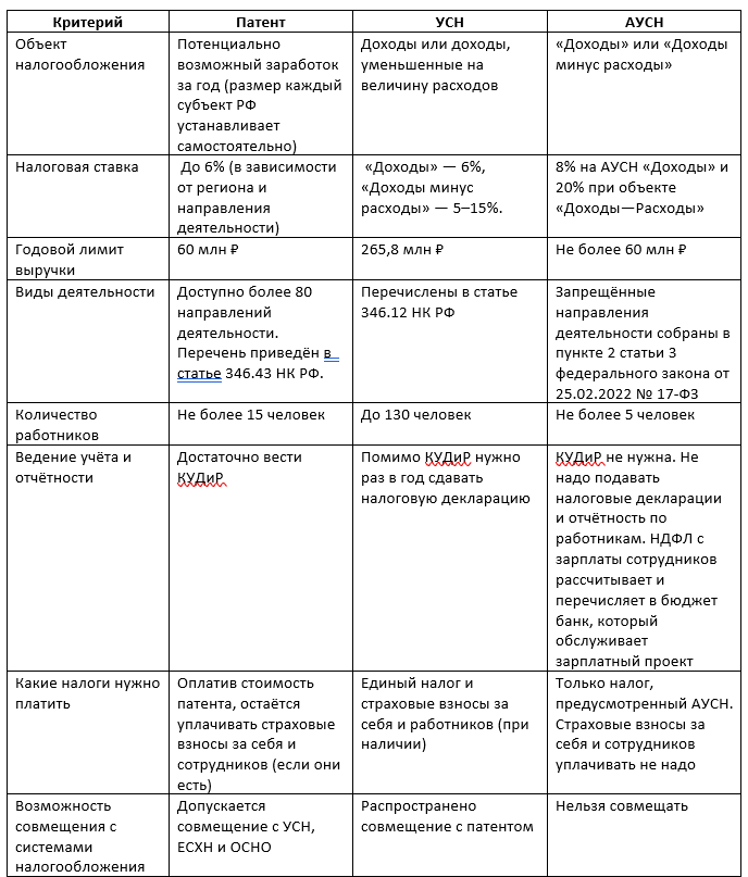 Иными словами, работать на ОСНО индивидуальным предпринимателям слишком затратно. Поэтому проведём сравнительный анализ патента с другими льготными налоговыми режимами — УСН и АУСН: